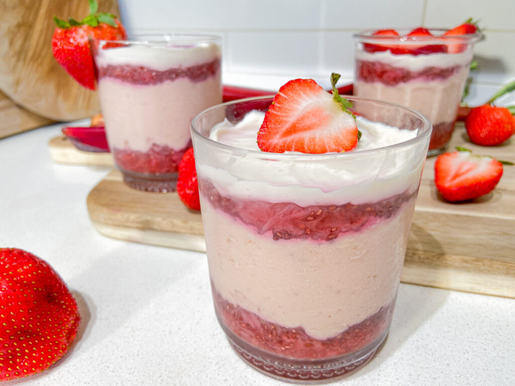 - Make the strawberry rhubarb jam: In a small pot add the frozen chopped strawberries and rhubarb. Add a splash of water, then cover and heat through over medium heat for 10 to 12 minutes, until all the fruit has released their juices and have become mashable. Add the maple syrup and salt and stir to combine. Remove from heat, then stir in the chia seeds, let sit for 10 minutes to thicken and cool slightly, stirring every few minutes to help disperse the chia.