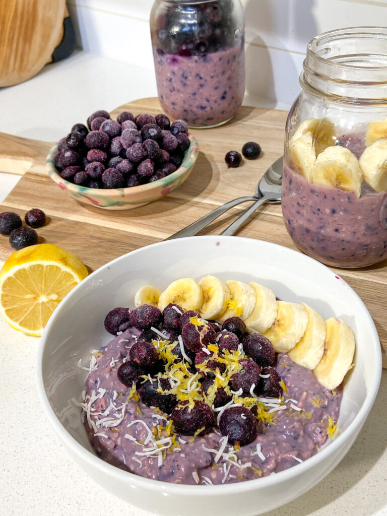 - Assemble the jars: Evenly divide the mixture into 3 jars and seal with a lid, then refigerate at least 4 hours or up to overnight. In the morning, serve with extra blueberries or banana slices and an extra sprinkle of lemon zest. Enjoy!
