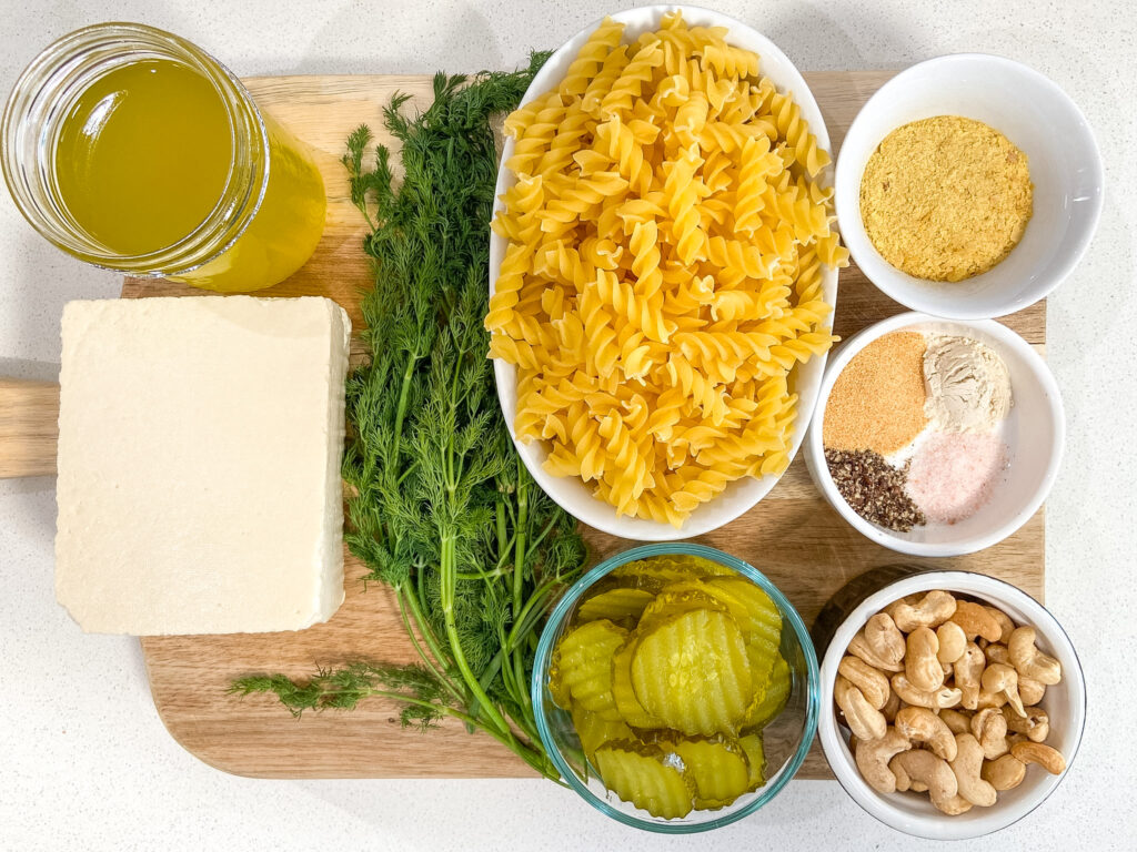 - Make the dill pickle pasta sauce: Into a high-speed blender add the soaked and drained cashews, block of silken tofu, nutritional yeast, dill pickle juice, spices, and fresh dill. Blend for about 30 seconds until completely smooth. Taste and adjust seasonings as you like; more pickle juice for extra tang, more salt or garlic powder, etc.