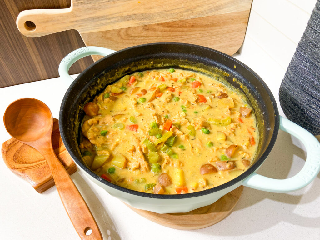 It was a great idea… except for the crust, which makes it not a one-pot meal, not to mention it adds a whole bunch of extra time-consuming steps. But not if there’s no crust! Why does there always have to be a crust? It’ll still be just as cozy and comforting without it… and thus, my Crustless Vegan Chicken Pot Pie was born.