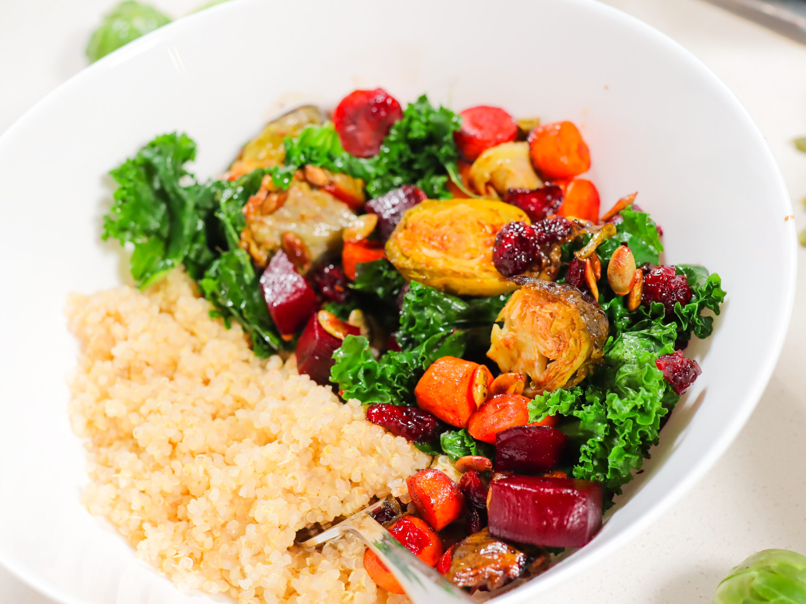 - Carrots, Beets & Brussels Sprouts are roasted to perfection and make up the bulk of this hearty salad.