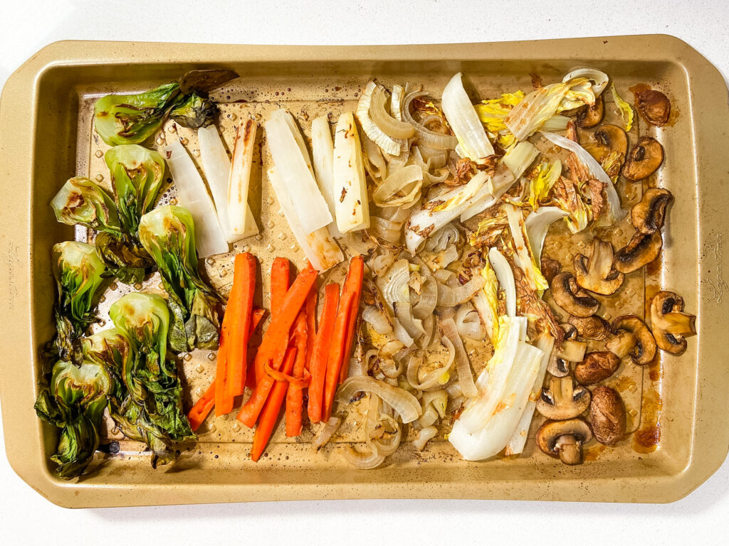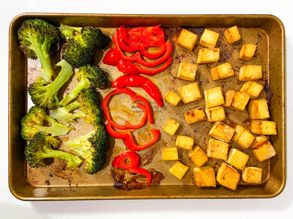 - Roast for 20-25 minutes, flipping halfway, until the veggies are crisp-tender or cooked to your liking, and the tofu is golden brown.