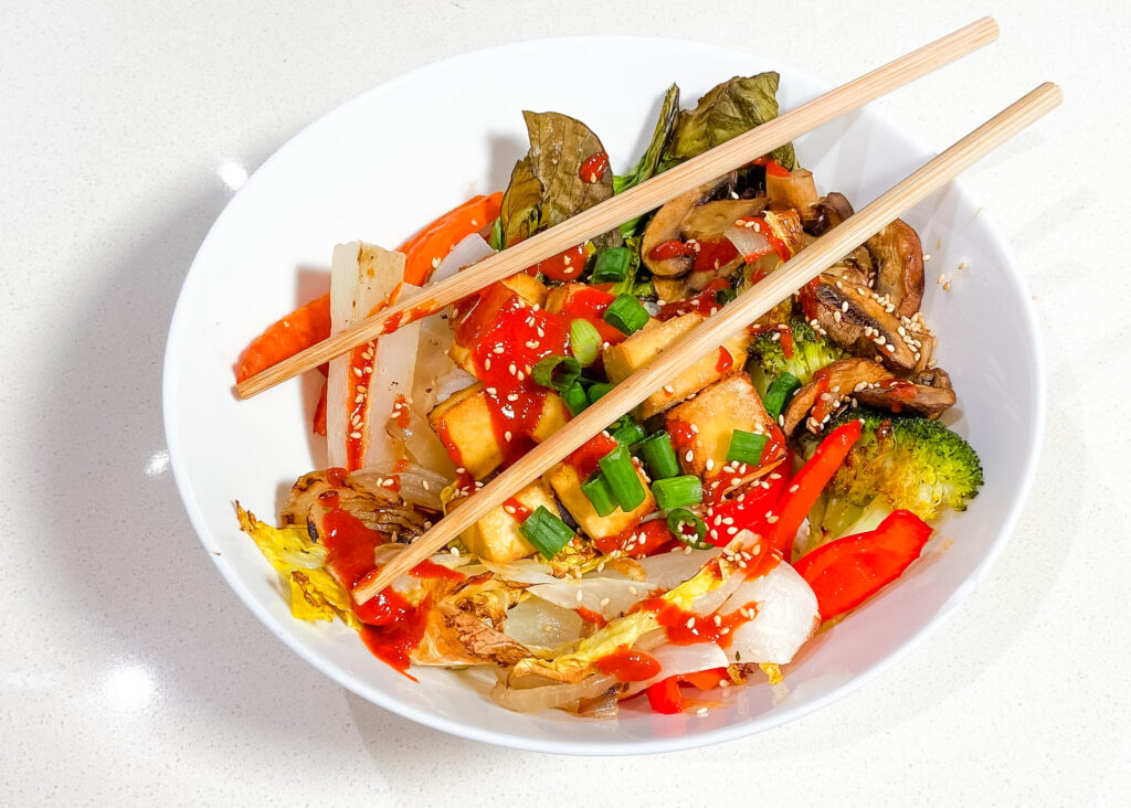 - Mix together the gochujang sauce. Assemble your bowls with cooked rice, veggies and tofu and a drizzle of the gochujang sauce, then mix it all together.