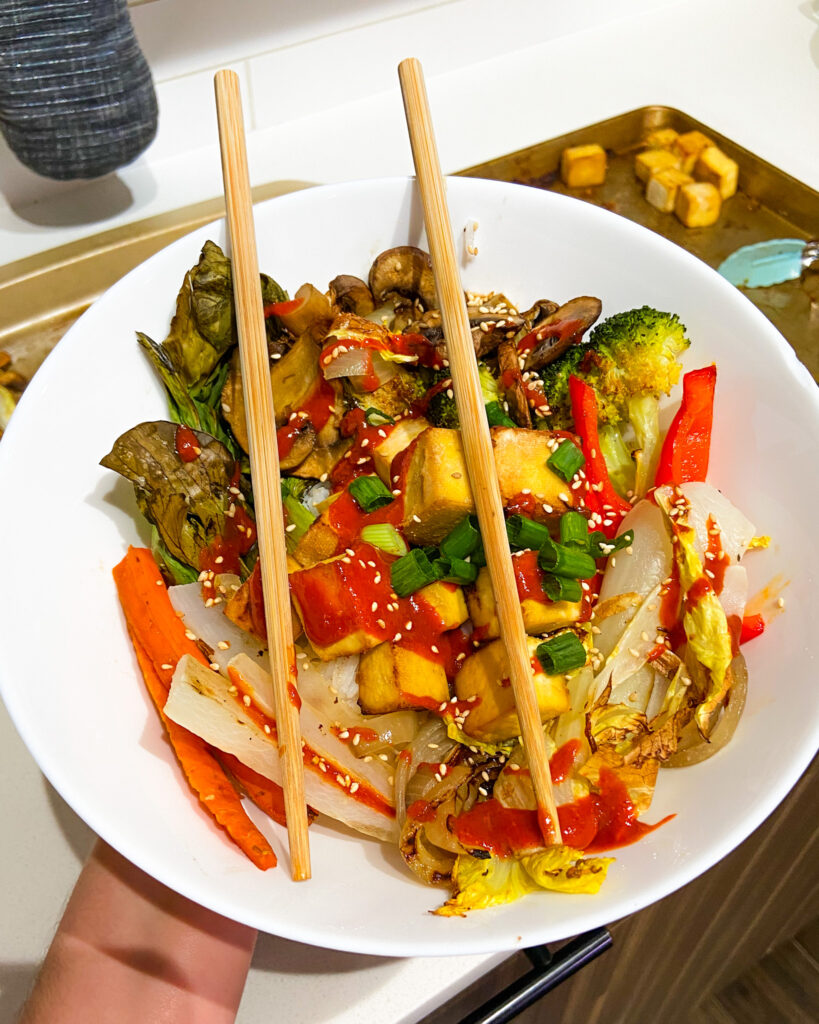 - Chop all your veggies of choice, about 4 to 6 cups, and tofu and dump on the sheet pans. Season the tofu directly on the pan with 1 tbsp of soy sauce or tamari, salt and ½ tsp onion powder, and gently toss with your hands. Lightly spray the veggies with cooking oil and a dash of salt.