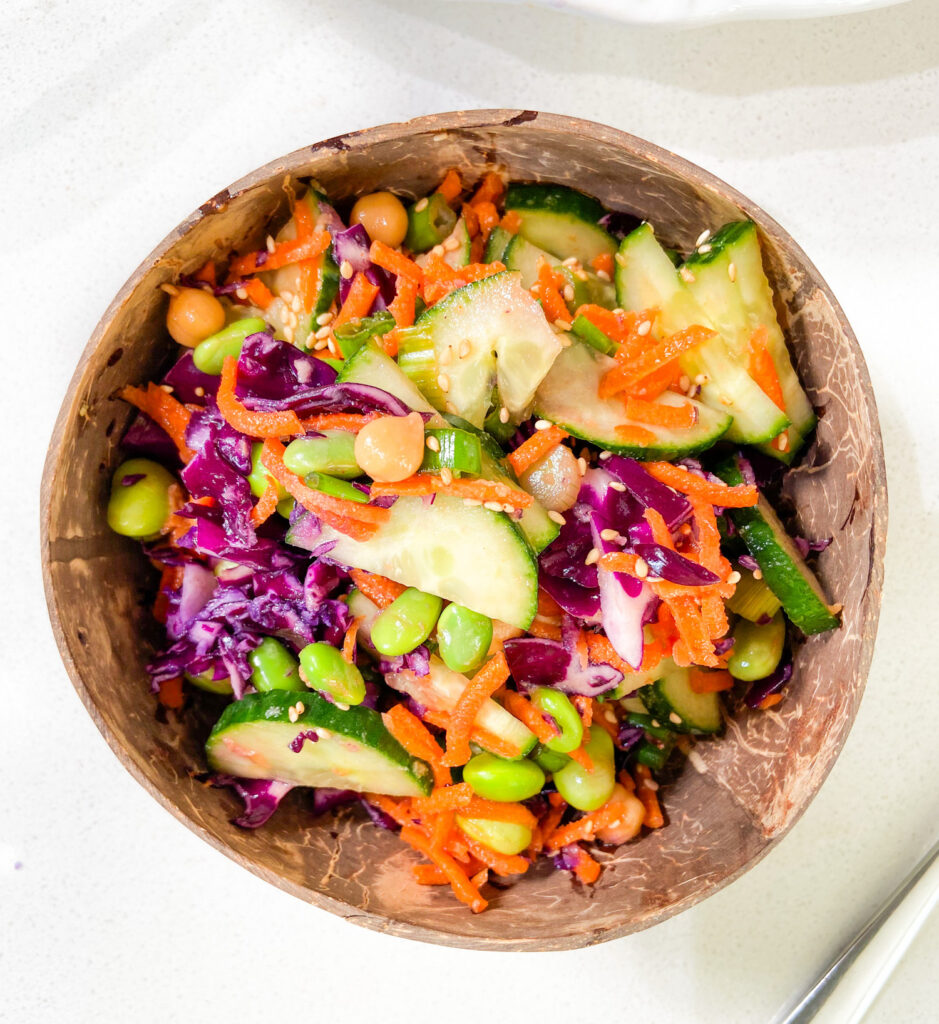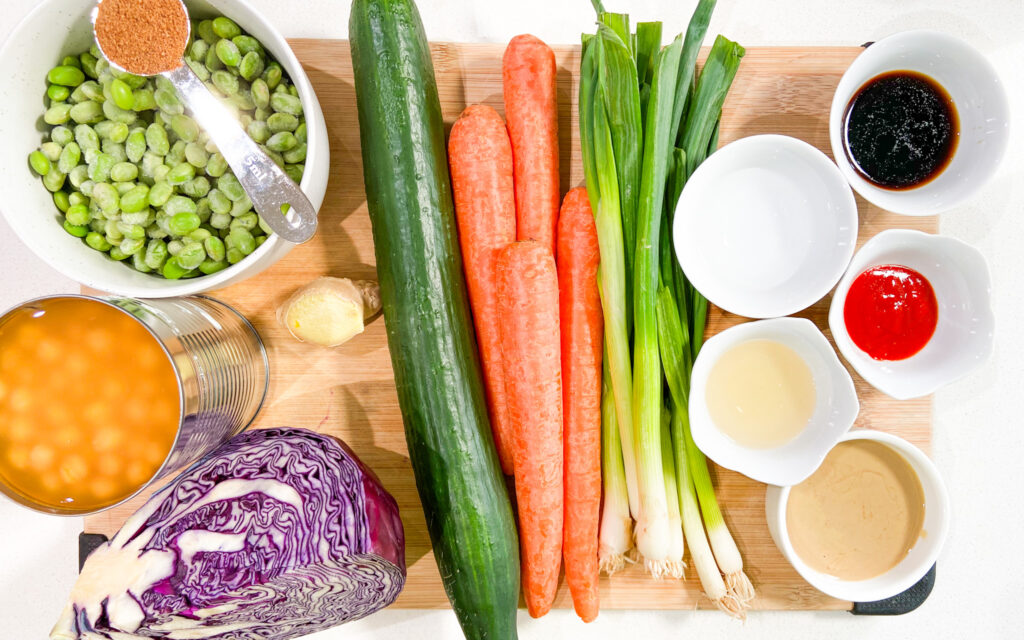 2. Build the base: In a large bowl, combine the edamame, chickpeas, cabbage, carrots, cucumber, and green onions.