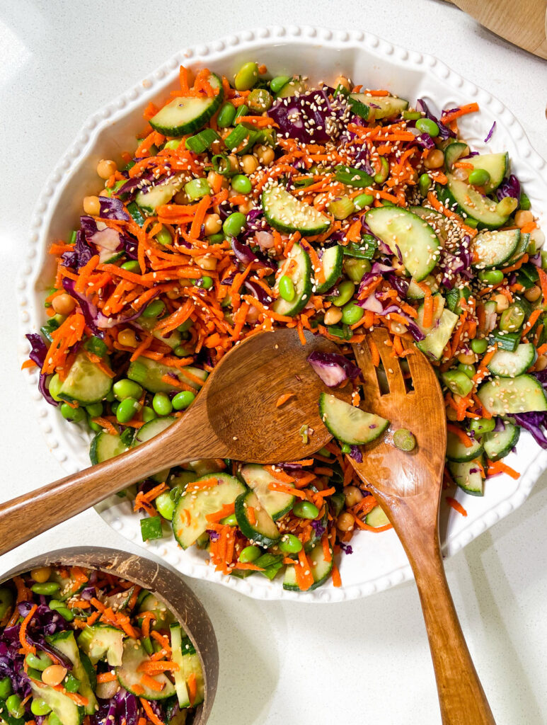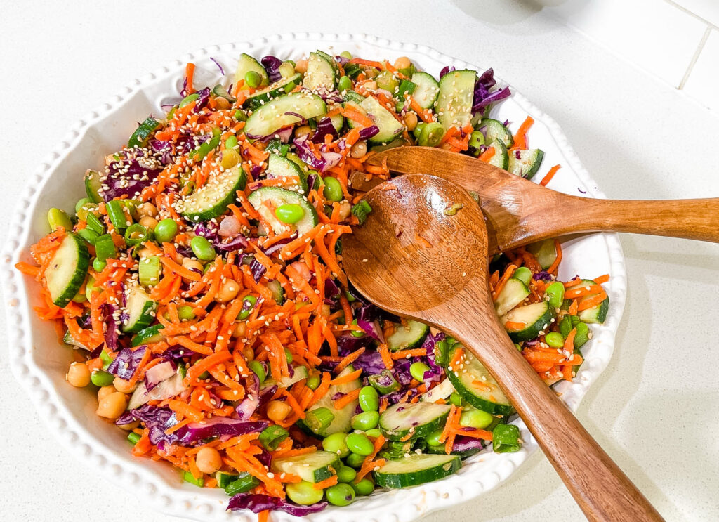 In a large bowl, combine the edamame, chickpeas, cabbage, carrots, cucumber, and green onions.