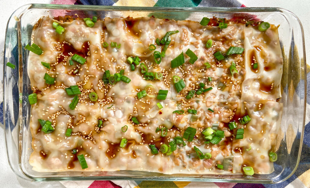- Grab a medium-sized casserole dish of any shape and lightly coat the bottom and sides in toasted sesame oil (or use cooking spray). Add a layer of wonton wrappers along the bottom, dunking them in a bowl of water first, until the bottom is completely covered. Spoon a layer of the filling on top, eye-balling it to make sure you have enough for about 3 layers total. Repeat with the wonton layers and filling, and add a final layer of wonton wrappers to the top (doubling the top layer if you want it a bit chewier). Lastly, pour over ½ cup of veggie broth on top.
